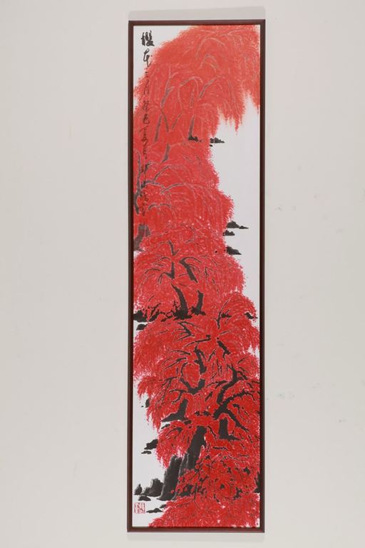 色彩上以紅、黑二色系為基調,構圖則以S曲線為主,舖陳出單純、簡捷之彩墨效果。