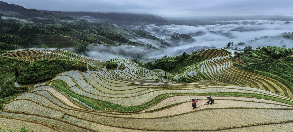 鬼斧神工的梯田是紅瑤族祖先純手工打造的幾何藝術,昨夜雷雨交加後,今晨綿延磅礡的雲霧繚繞山頭,年輕夫妻乘著雨停協力趕工春耕,構成一幅大自然壯麗的畫卷.