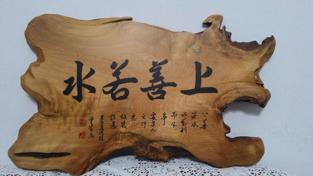 老子 道德經 第八章若水篇 上善若水 意為最高境界的善行就像水的品性一樣,澤被萬物而不爭名利。 此作品材質台灣檜木
